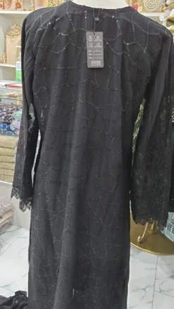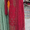 A stunning chiffon 3 Piece party wear kameez, features an beaded front neckline, followed by a straight slit side.