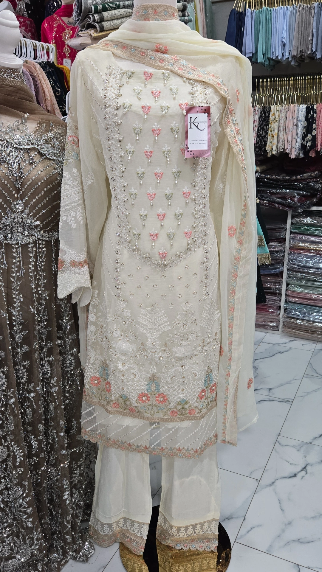 A stunning beaded cream chiffon 3 Piece party wear kameez, features an beaded front and back neckline, followed by a straight slit side. Embroidery work throughout the attire.