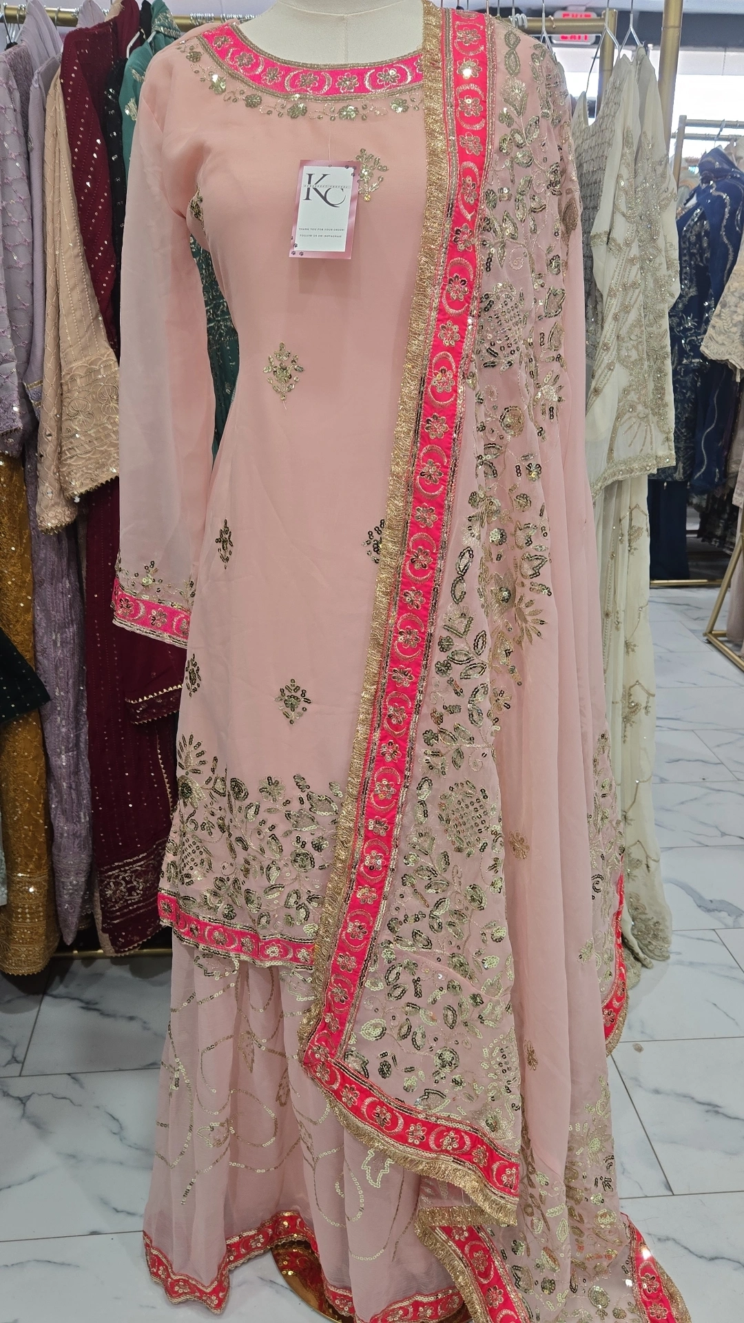A stunning 3 Piece party wear sharara. Work throughout the attire.